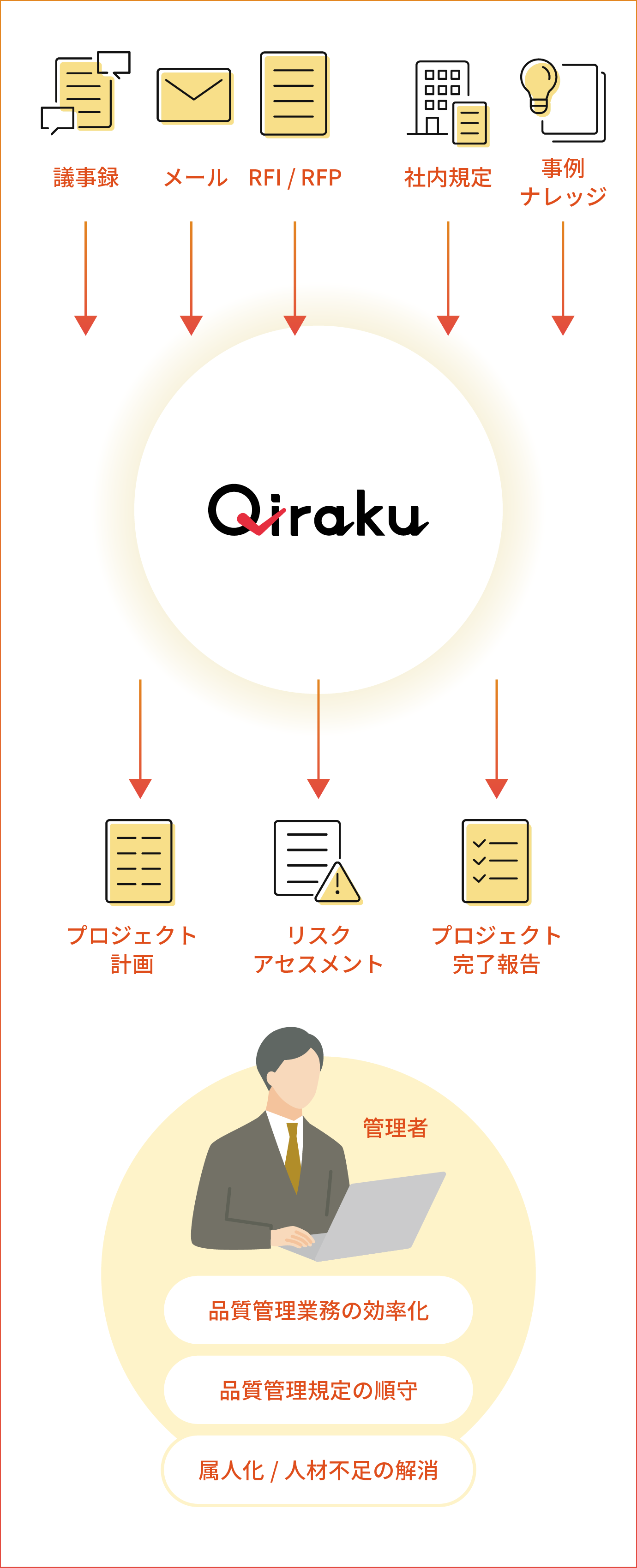 プロジェクト中に保存・生成された情報はQiraku内にナレッジとして蓄積され、次回以降のプロジェクトでの類似事例を活かしたアウトプット生成に必要なRAGを構築します。