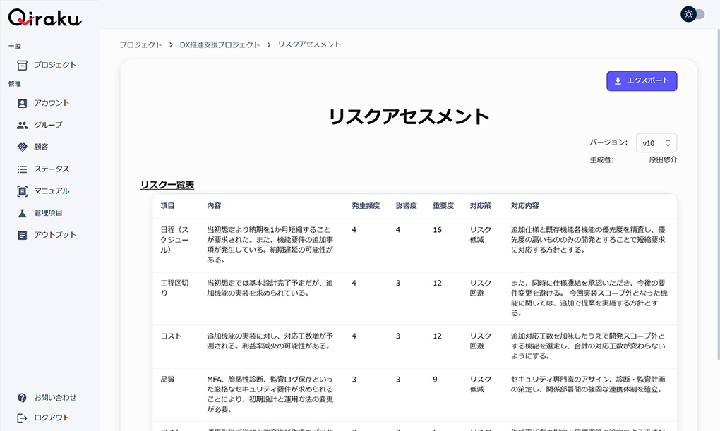 仕様変更等が発生した際は、情報を適宜Qirakuにアップ・登録することで、プロジェクト管理やリスクアセスメントの内容を再生成し、必要な対応を確認できます。